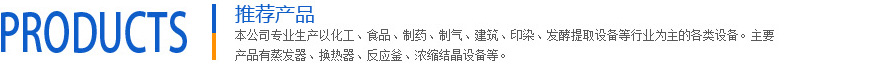 本公司專業(yè)生產(chǎn)以化工、食品、制藥、制氣、建筑、印染等行業(yè)為主的各類設(shè)備。主要產(chǎn)品有發(fā)酵提取設(shè)備,濃縮結(jié)晶設(shè)備,蒸發(fā)器、換熱器、反應(yīng)釜、分離容器、儲罐、熱交換器、冷凝器,全自動供水設(shè)備、不銹鋼裝配式水箱、凝結(jié)水回收等各類壓力容器及非標(biāo)產(chǎn)品。其中離心式刮板薄膜蒸發(fā)器獲江蘇省優(yōu)質(zhì)產(chǎn)品。